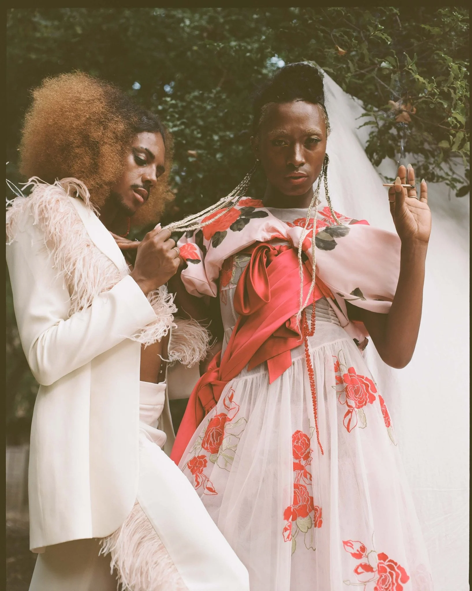 In her left hand, her phone flashes as it records this very conversation. In the other, she holds a brush while a makeup artist is drawing the final touches to a high white brow that now covers most of her forehead. Behind is a room of 10+ people frantically putting together a lilac balloon dress that’s about to house our star. We make close eye contact as we’re instructed to our next move: “We’ve got makeup. We’ve got questions. Let’s roll!”
